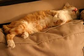 Vendo o gato esparramado no sofá, ele tem a brilhante ideia de dar um tapa no bichano, que sai gritando: